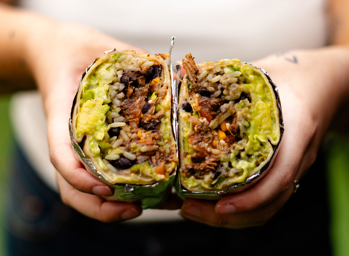 A Flour Tortilla Filled with Cilantro Rice, Black Beans, Lettuce, Sour Cream, Pico De Gallo and Cheddar Cheese + Guacamole for £1